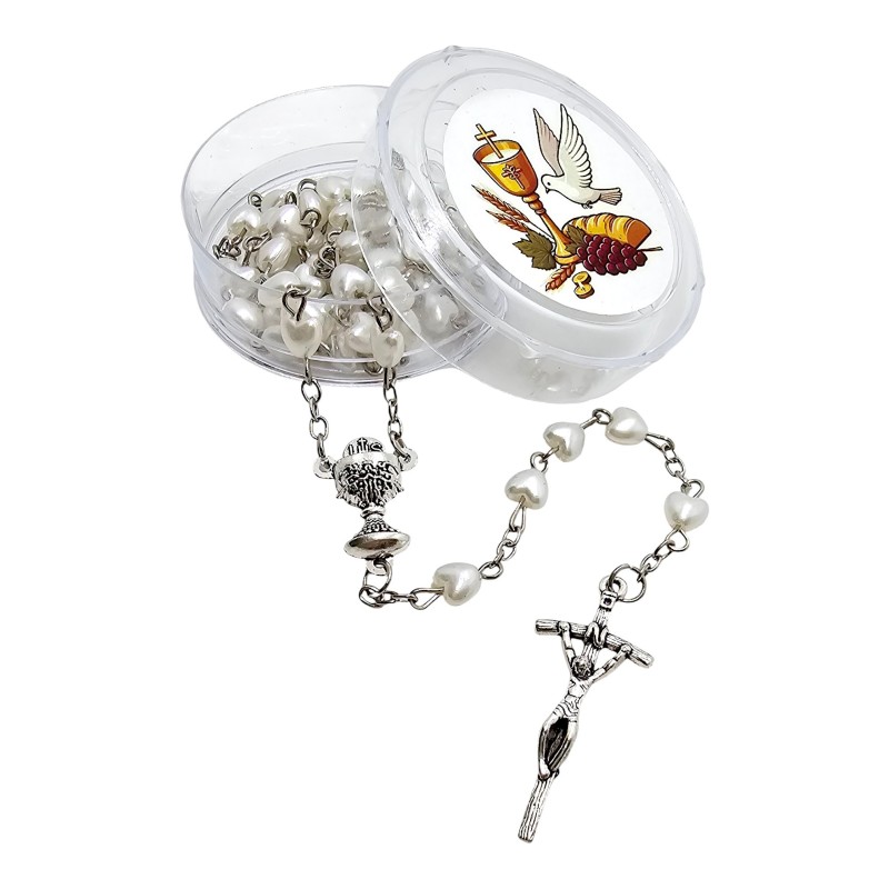 Różaniec jest pakowany w przezroczyste pudełko, które chroni go i pięknie eksponuje. Pudełko ozdobione jest naklejką z symbolicznymi motywami Eucharystii, co podkreśla charakter okazji i sprawia, że jest to prezent gotowy do wręczenia.