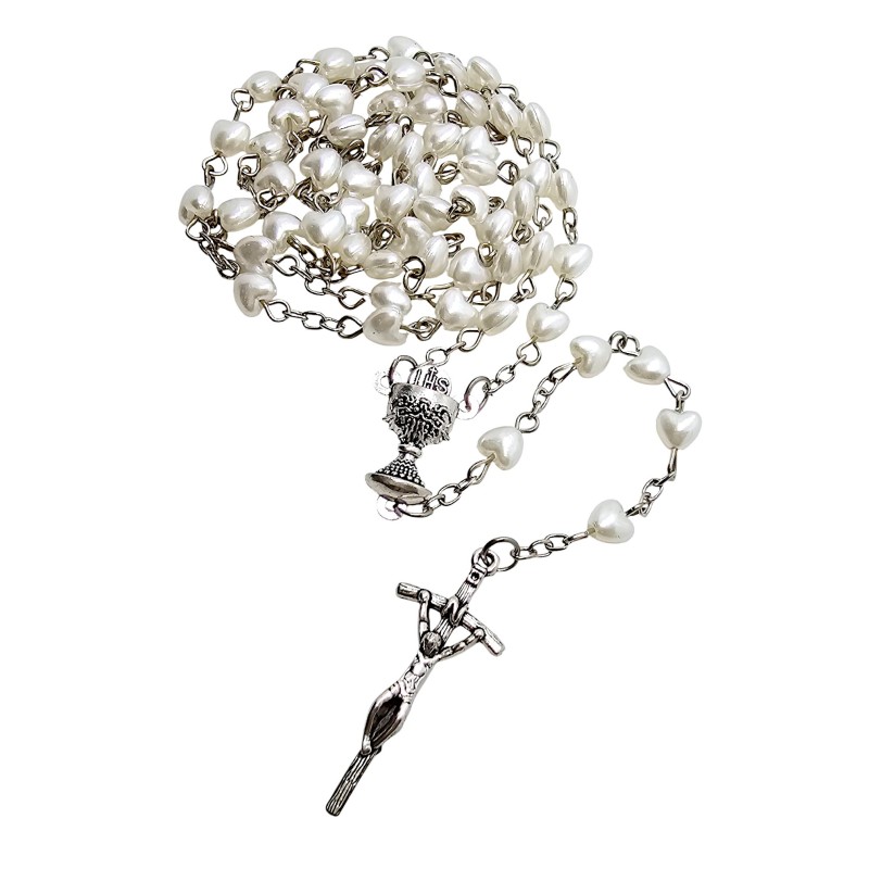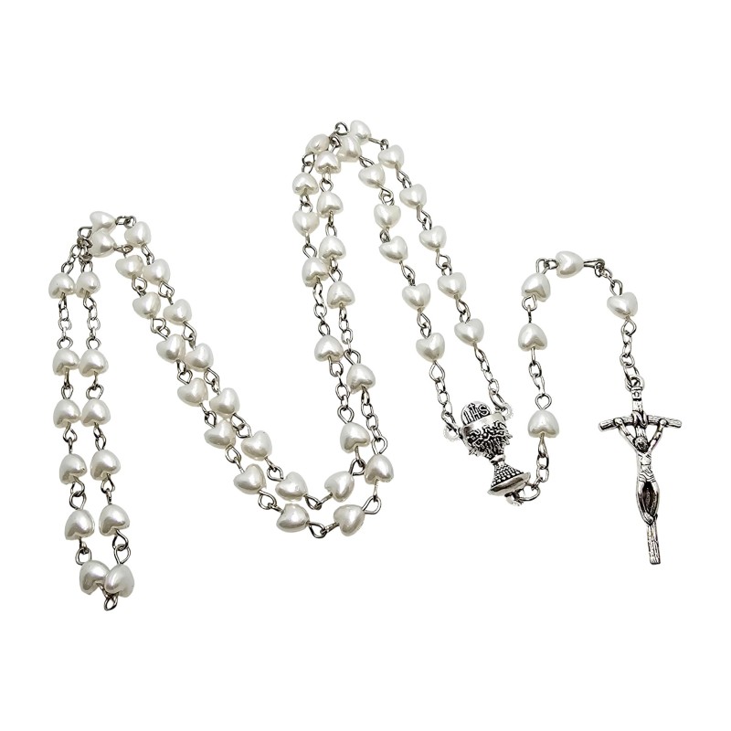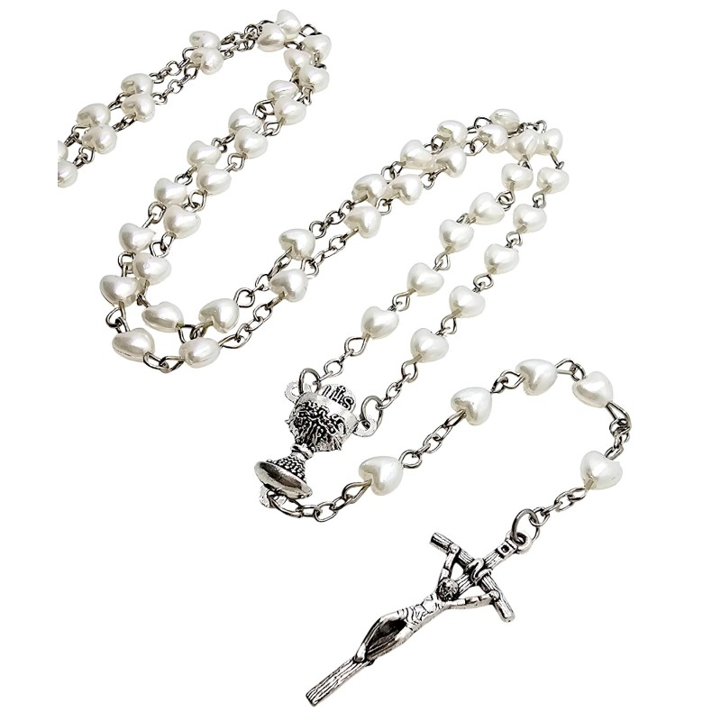 Różaniec wykonany jest z nietuzinkowych, białych koralików w kształcie serca, które pięknie kontrastują z metalowym łańcuszkiem, nadając całości bardzo eleganckiego charakteru. Jest to idealny wybór dla osób ceniących oryginalność i styl.