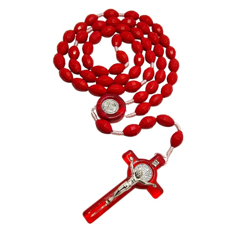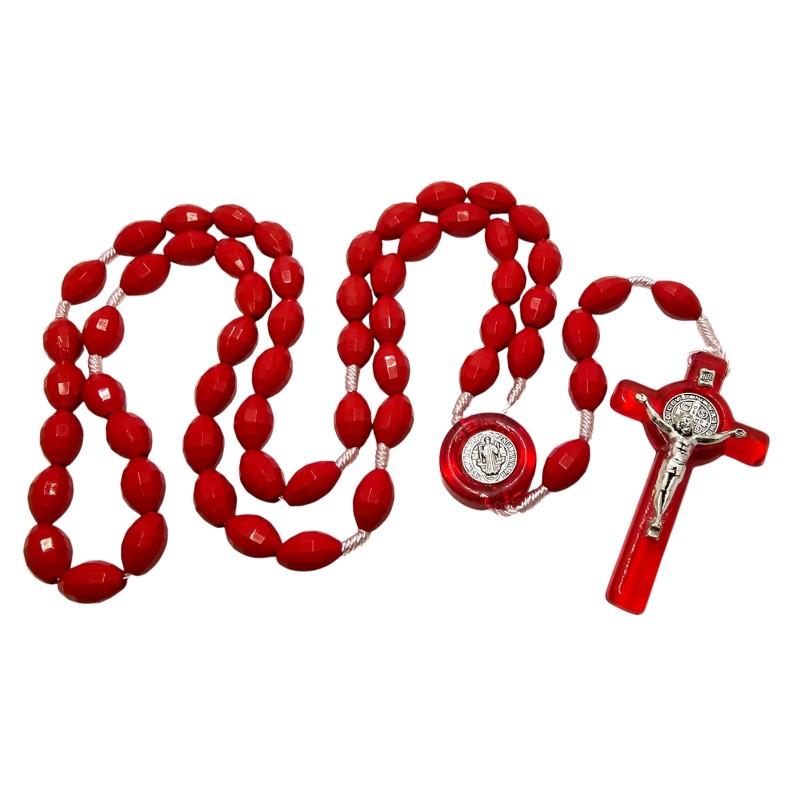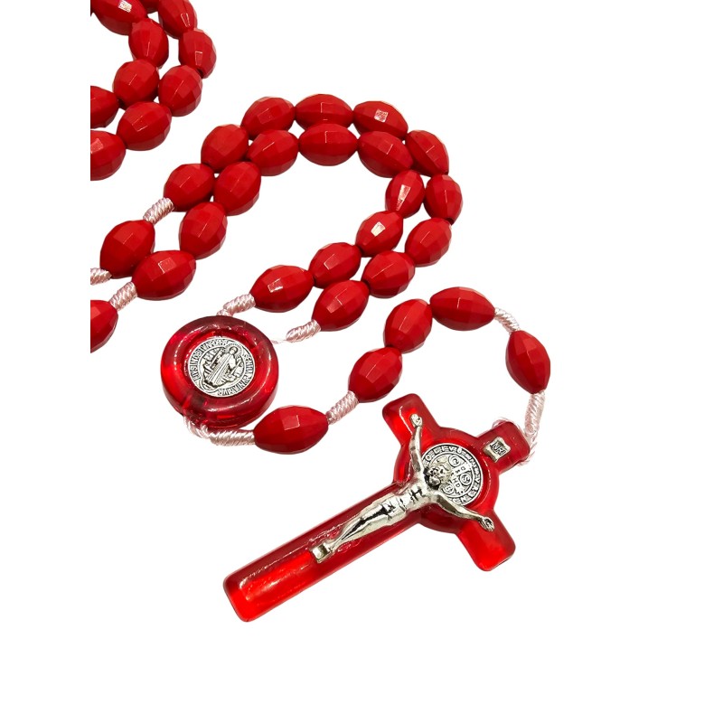 Różaniec jest wykonany z czerwonego plastiku, dzięki czemu jest niezwykle lekki, trwały i odporny na wodę. Owalne koraliki o wymiarach 14x9 mm delikatnie przypominają kryształki, dodając mu głębi koloru i blasku. Duży rozmiar koralików ułatwia modlitwę i pozwala na łatwe trzymanie w dłoni.