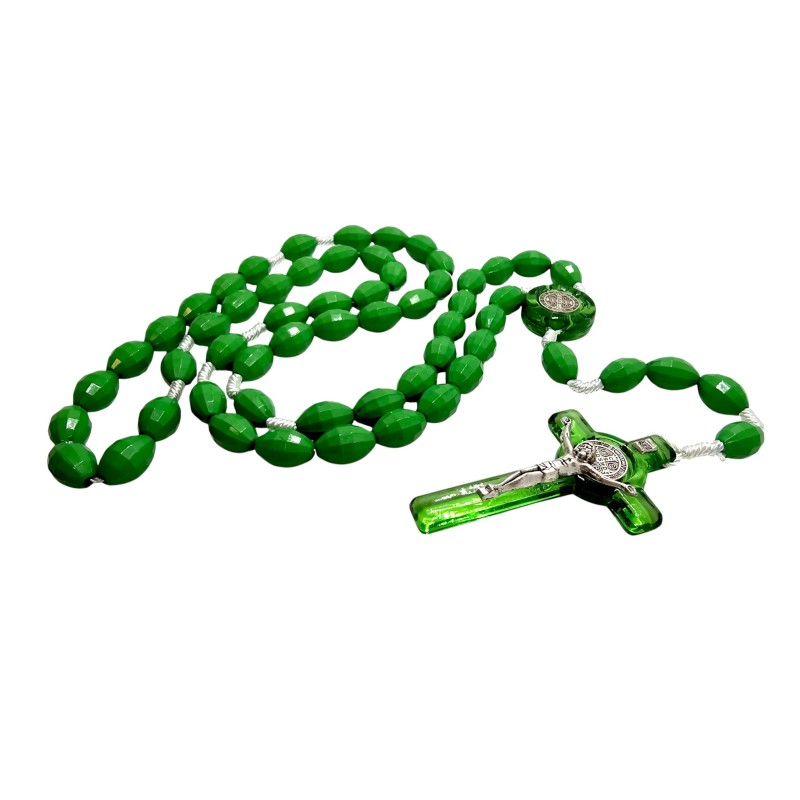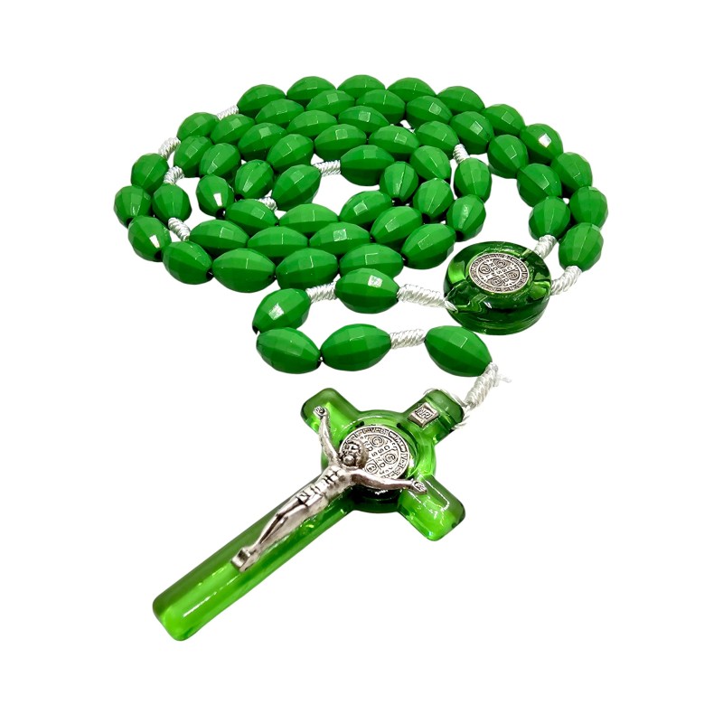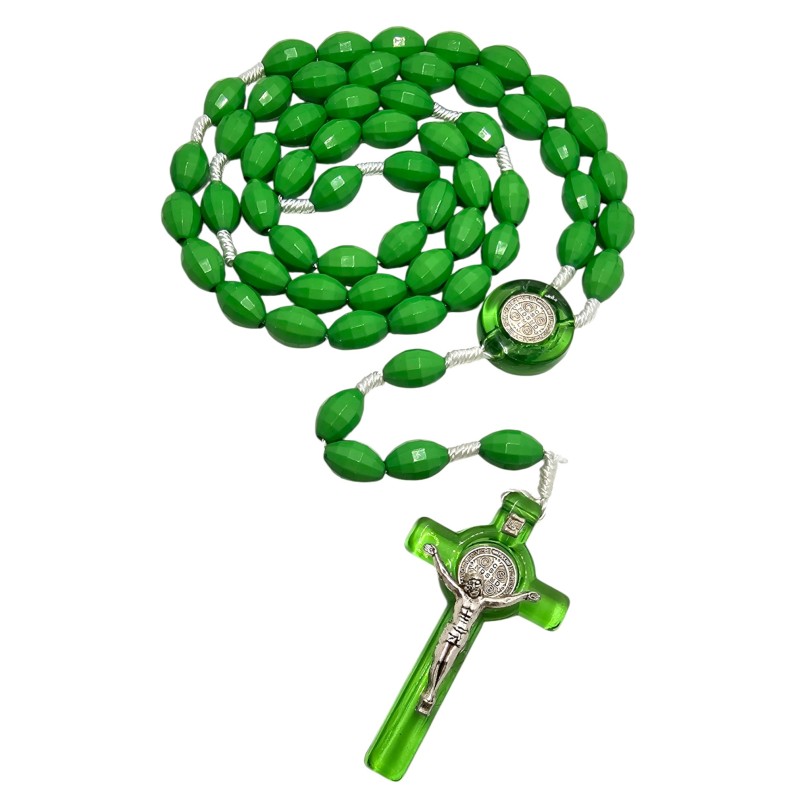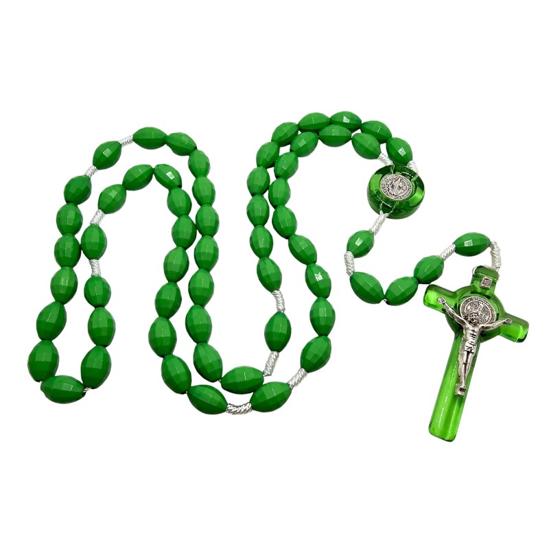 Różaniec jest wykonany z zielonego plastiku, dzięki czemu jest niezwykle lekki, trwały i odporny na wodę. Owalne koraliki o wymiarach 14x9 mm delikatnie przypominają kryształki, dodając mu głębi koloru i blasku. Duży rozmiar koralików ułatwia modlitwę i pozwala na łatwe trzymanie w dłoni.